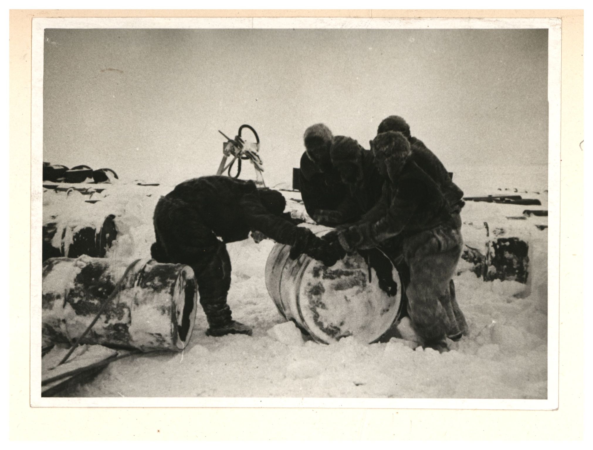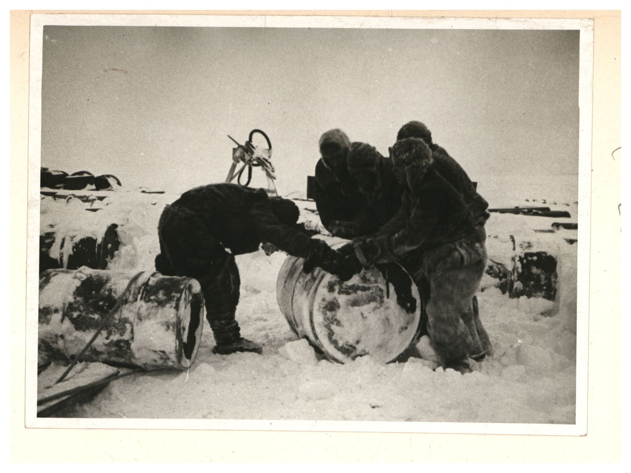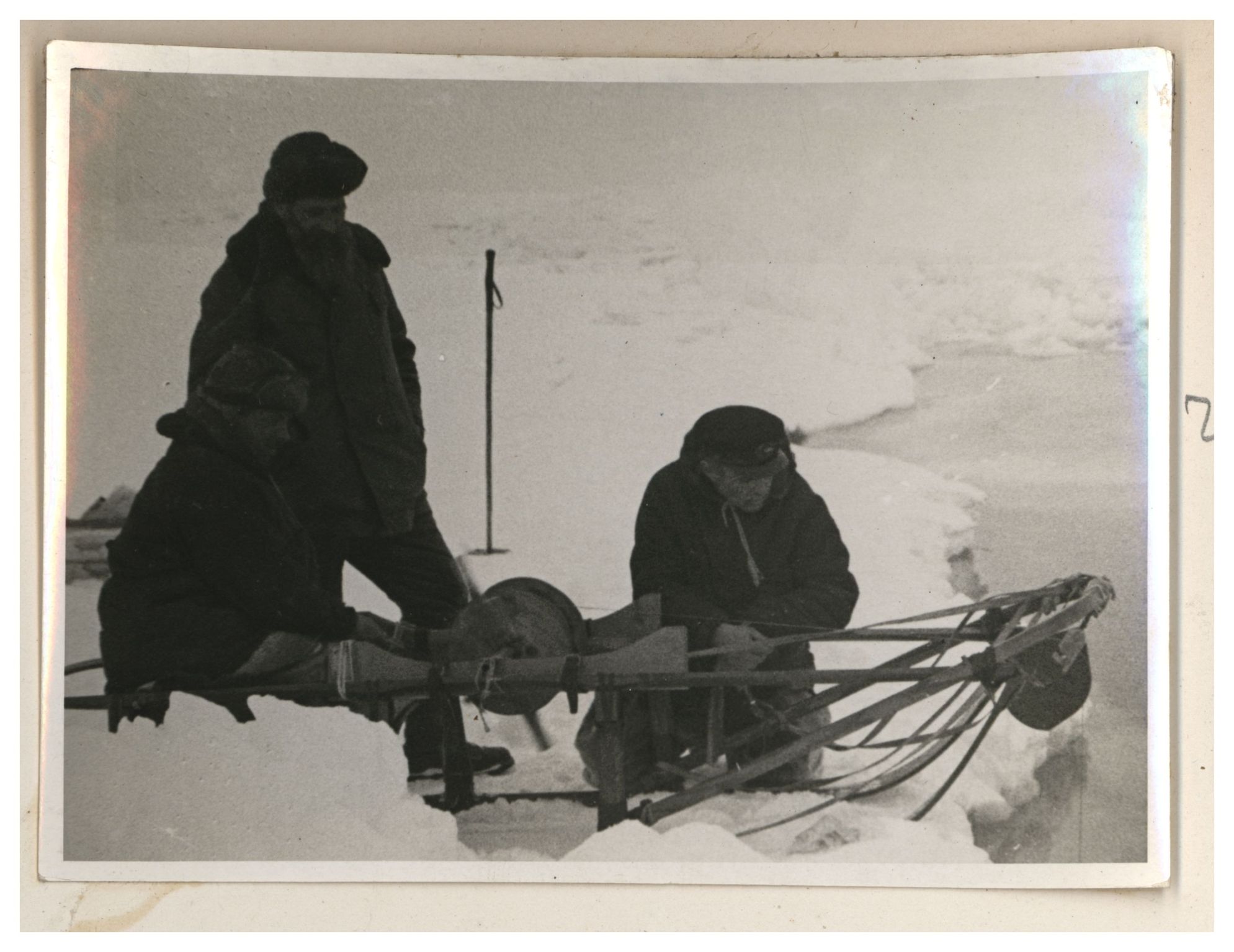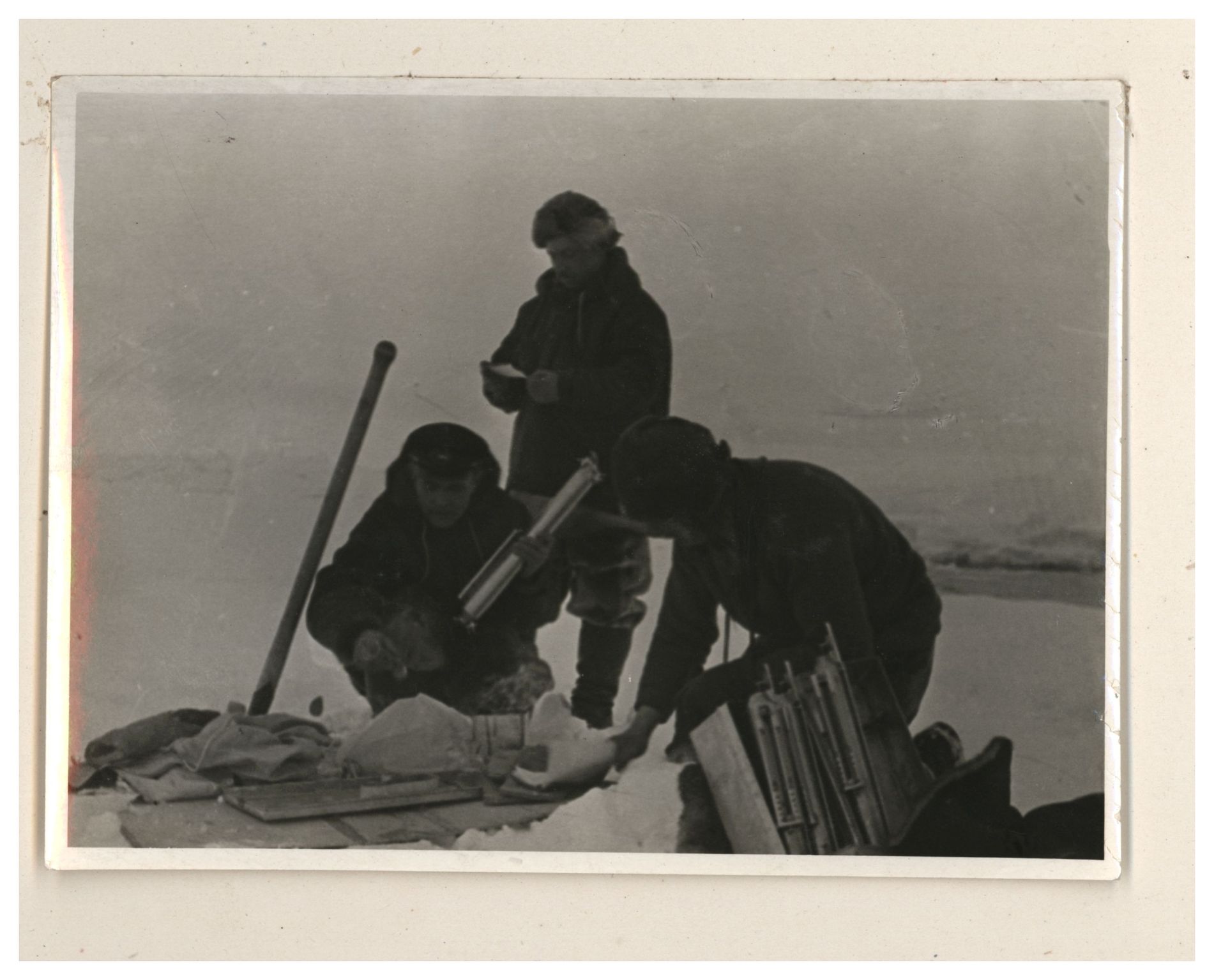 И.Д.Папанин, О.Ю.Шмидт, П.П.Ширшов налаживают гидрологическую лебедку