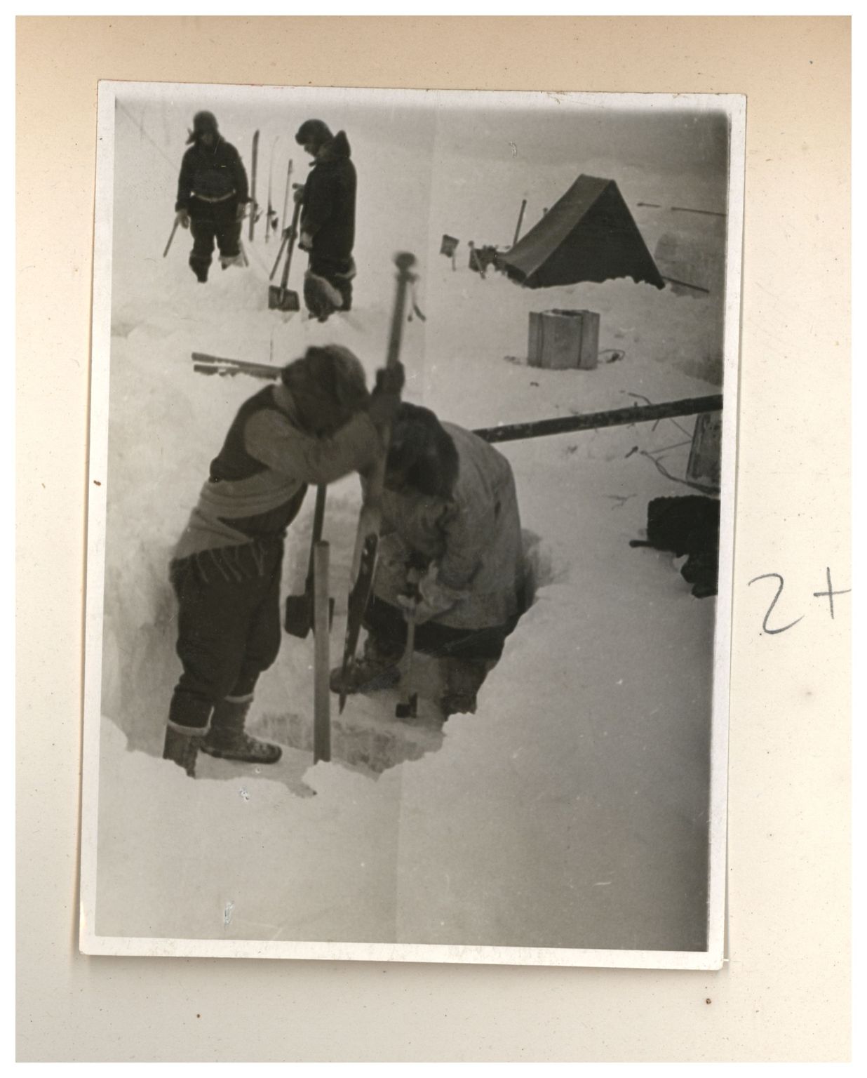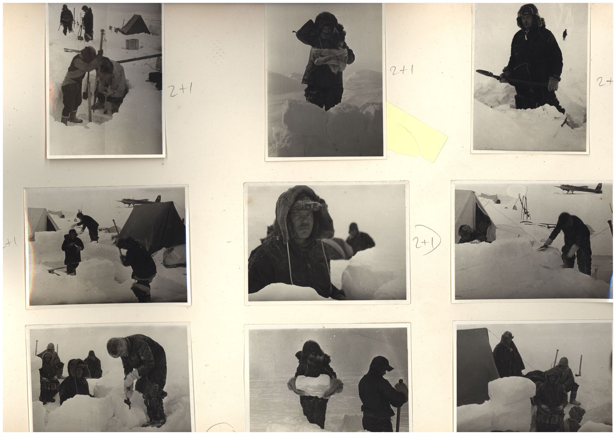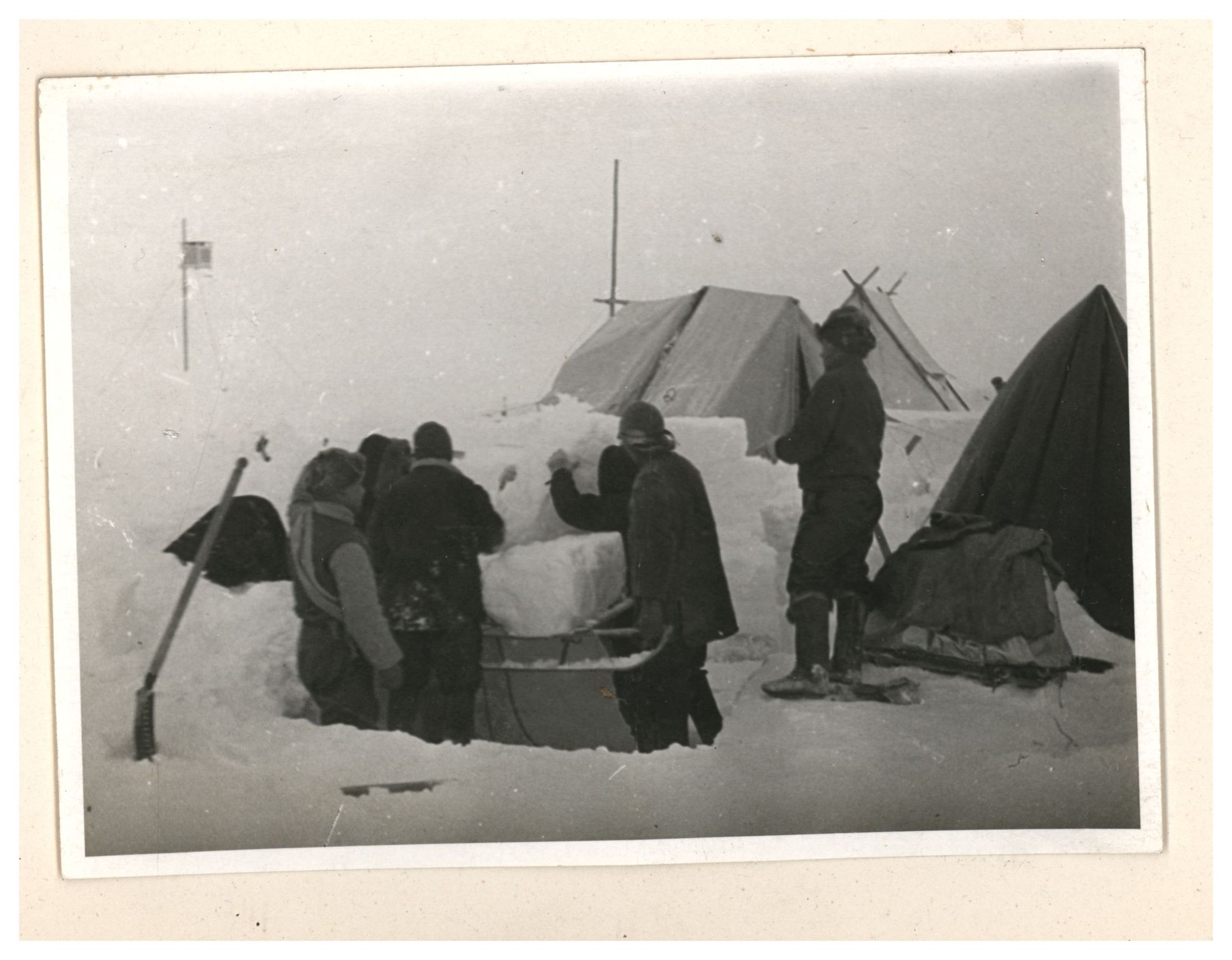 Заготовка снежных блоков для заградительной стены вокруг палатки