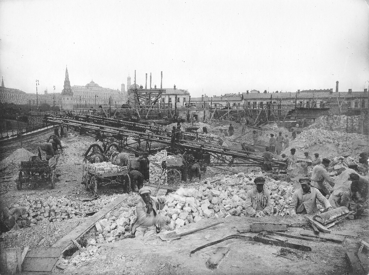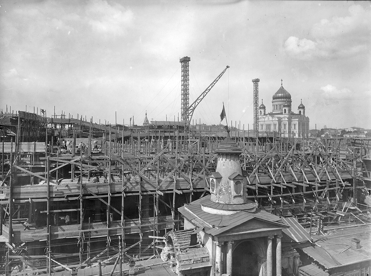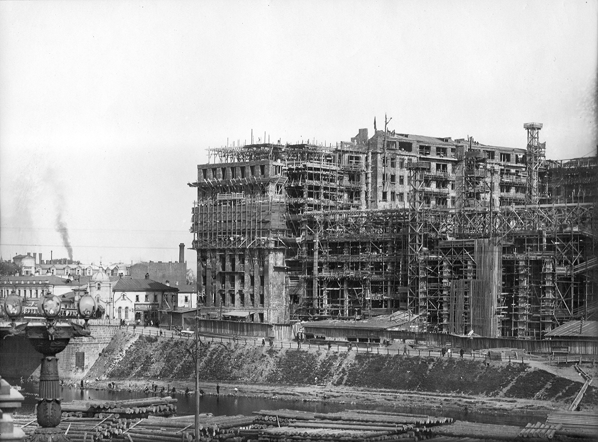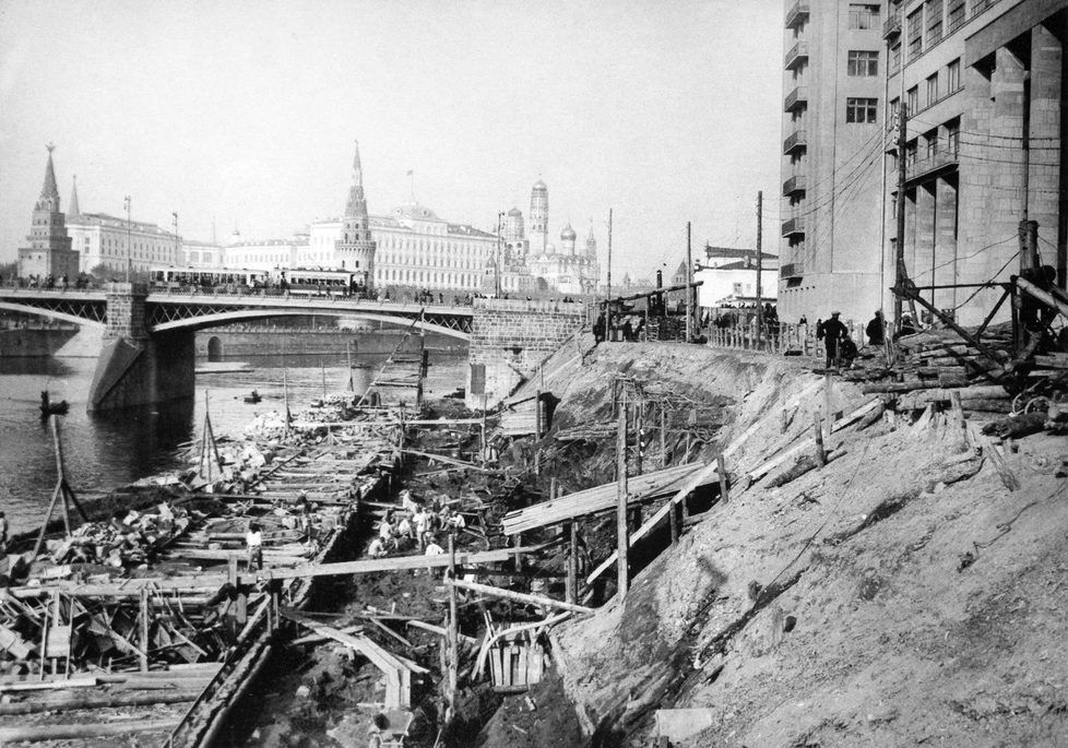 В начале февраля 1928 года — на месте бывшего Винно-Соляного двора, по Всехсвятской улице и Берсеневской набережной вовсю велись работы. С 1927 года выписывалась техника и из-за границы: механические подъемники, транспортеры песка и пр.
