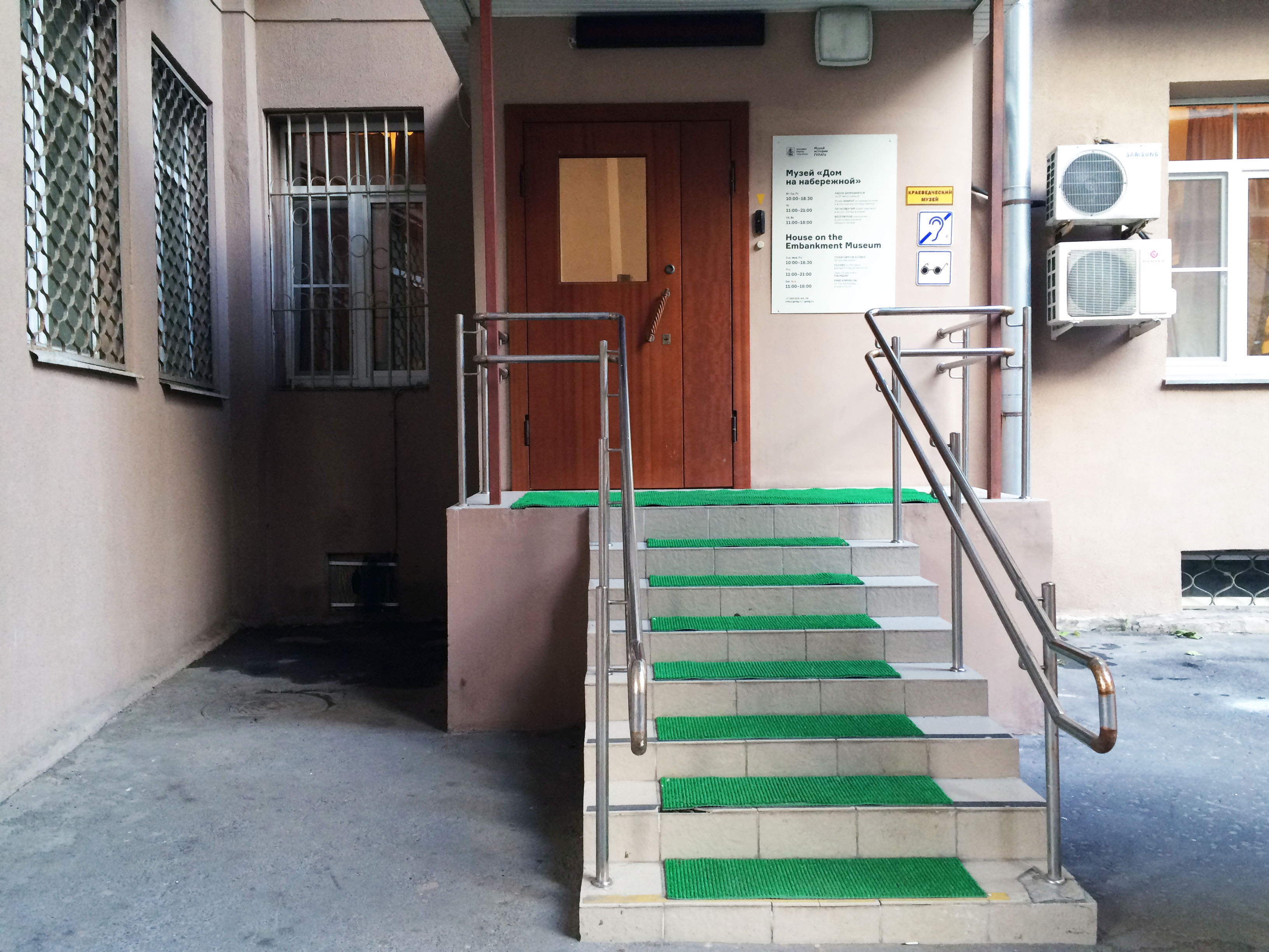 | Вход во двор дома через арку на ул. Серафимовича. Пройдя во двор, поверните направо. Вход в музей «Дом на набережной» расположен вблизи со входом в подъезд №1. | |
