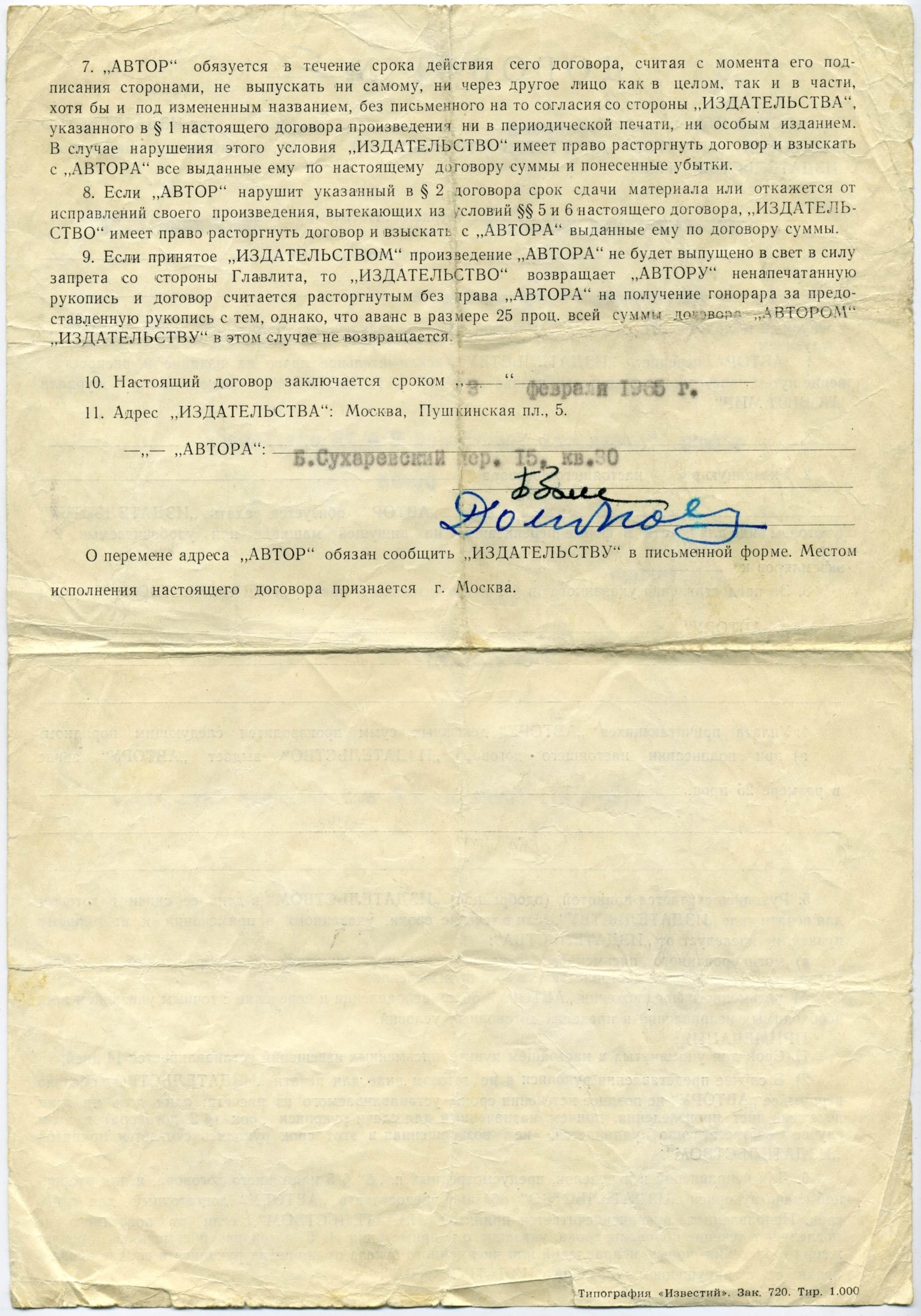 Договор издательства «Известия Советов депутатов трудящихся СССР» о передаче исключительных прав на издание и распространение в книжках издаваемого издательством ежемесячного журнала «Новый мир» романа «Хранитель древностей». Москва, 3 февраля 1964 г.