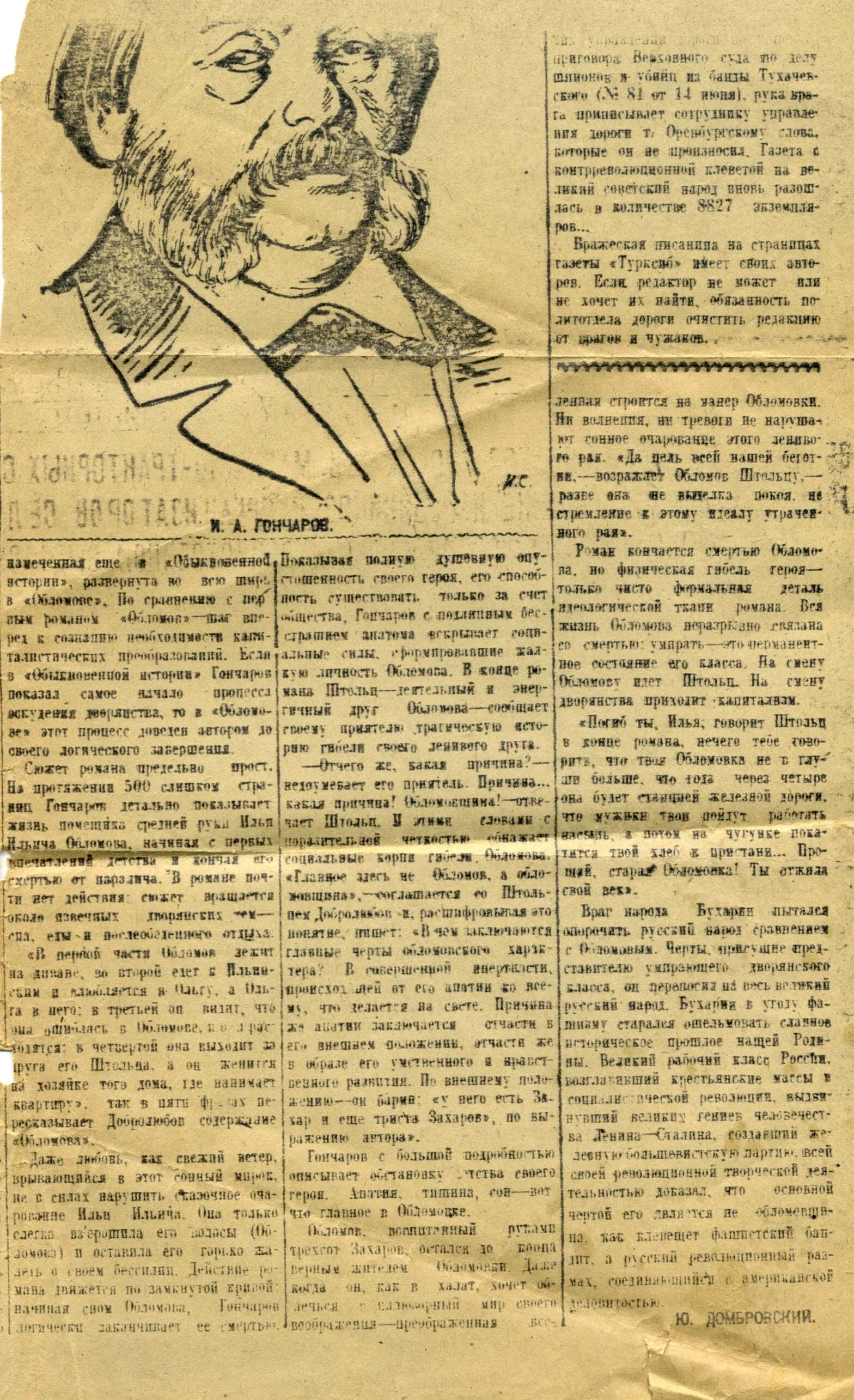 Ю. Домбровский. Мастер русского романа. К 125-летию со дня рождения И.А. Гончарова. Казахстанская правда, 1937 г.