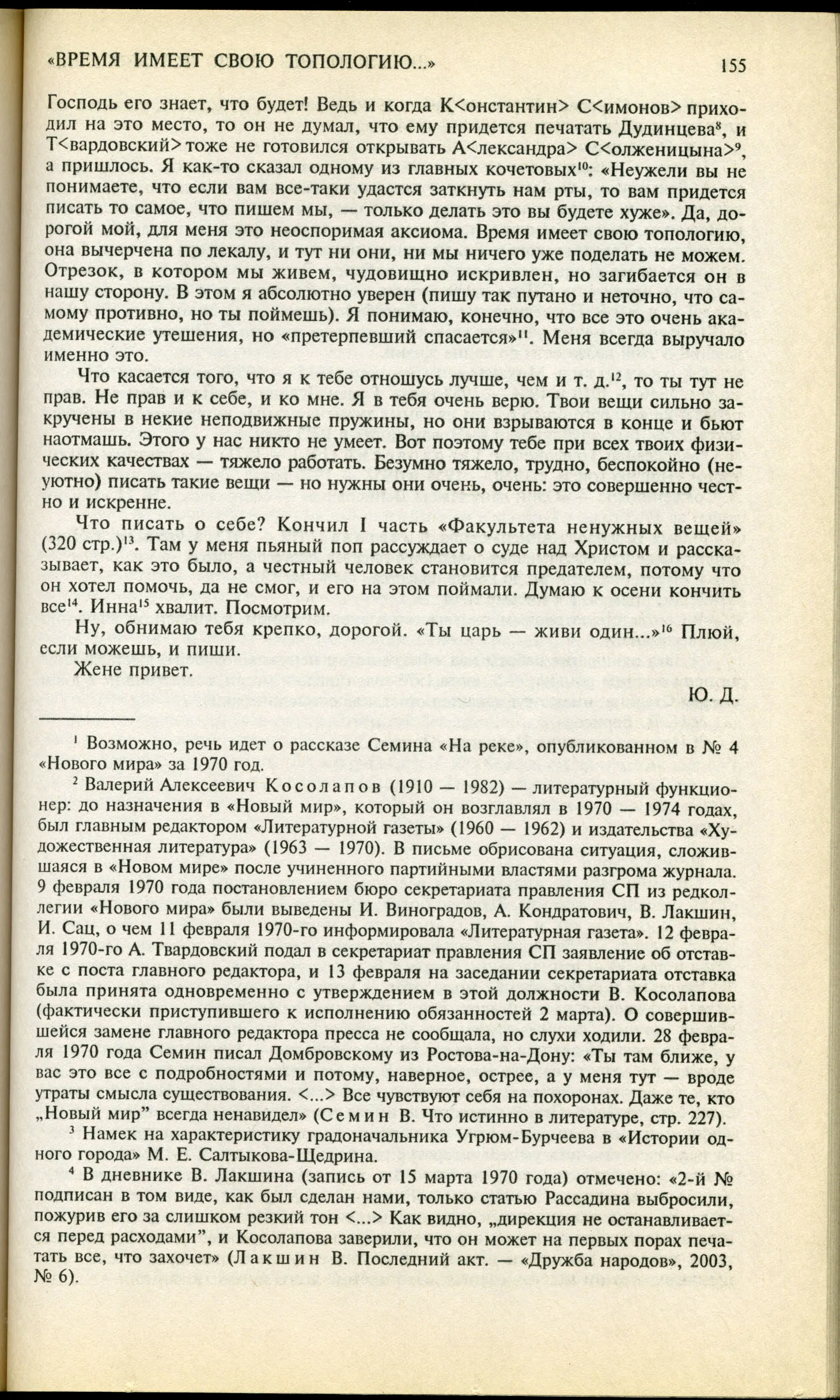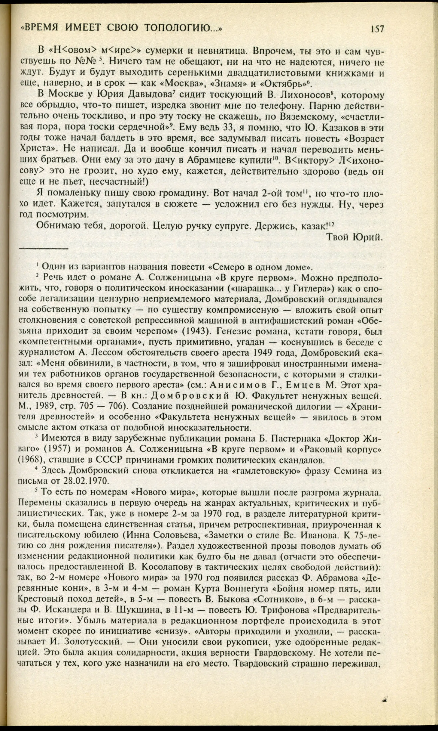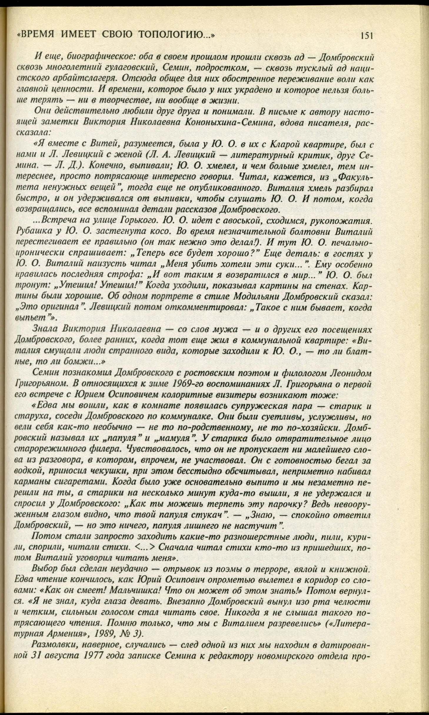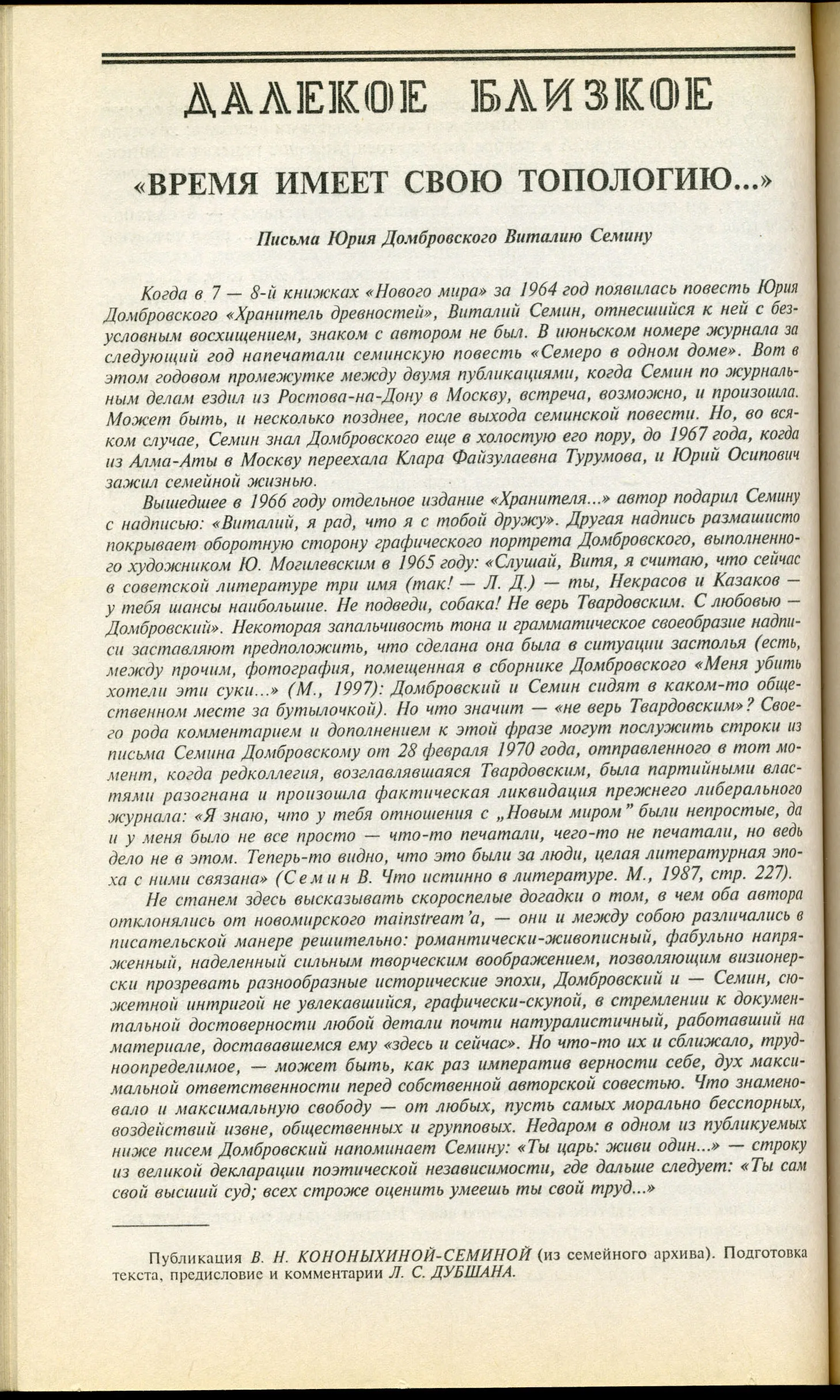 «Время имеет свою топологию…» Письма Юрия Домбровского Виталию Семину. Публикация В.Н. Кононыхиной-Семиной. Новый мир, 2004, №5, с. 150–159. Предисловие и комментарии Л. С. Дубшана.