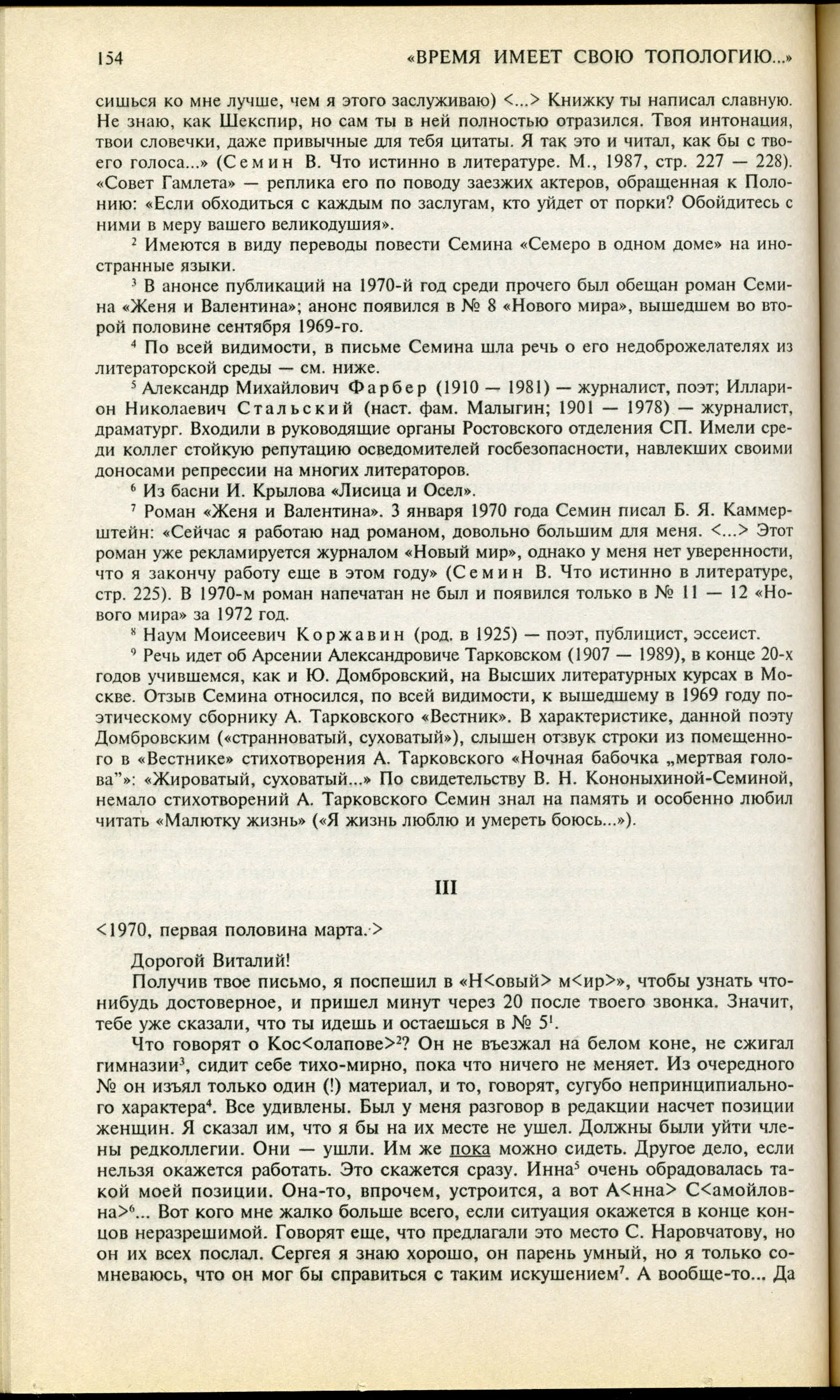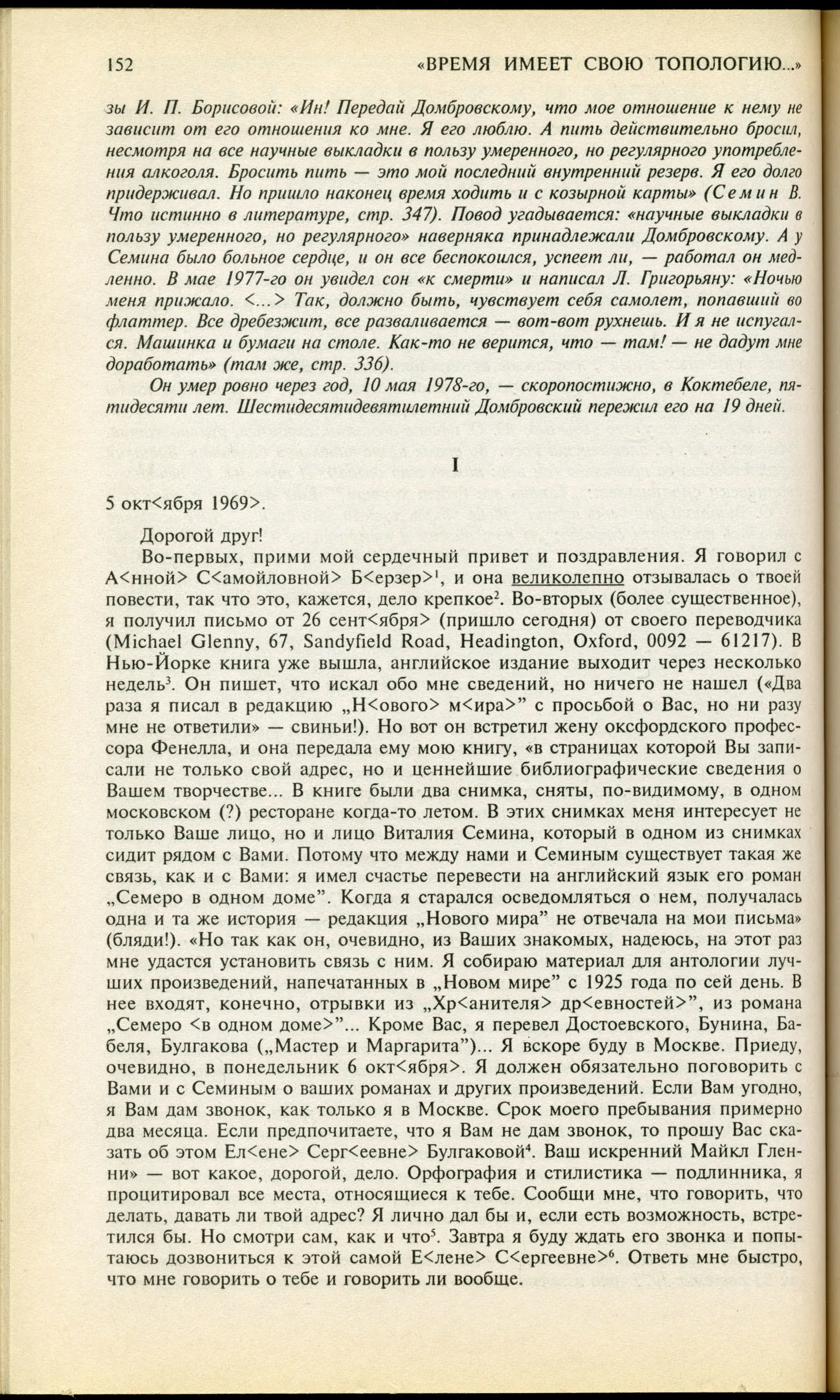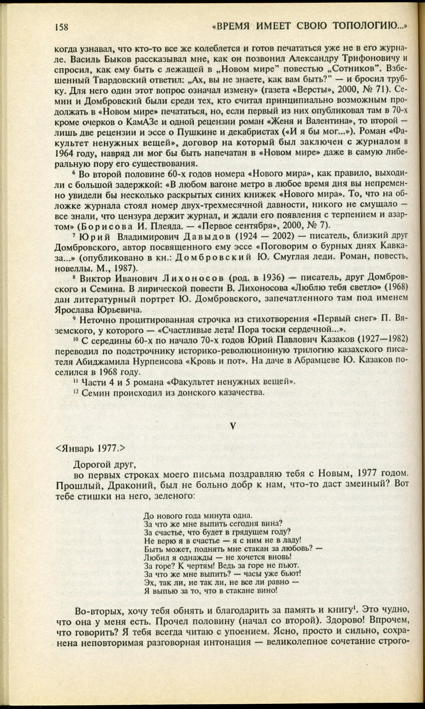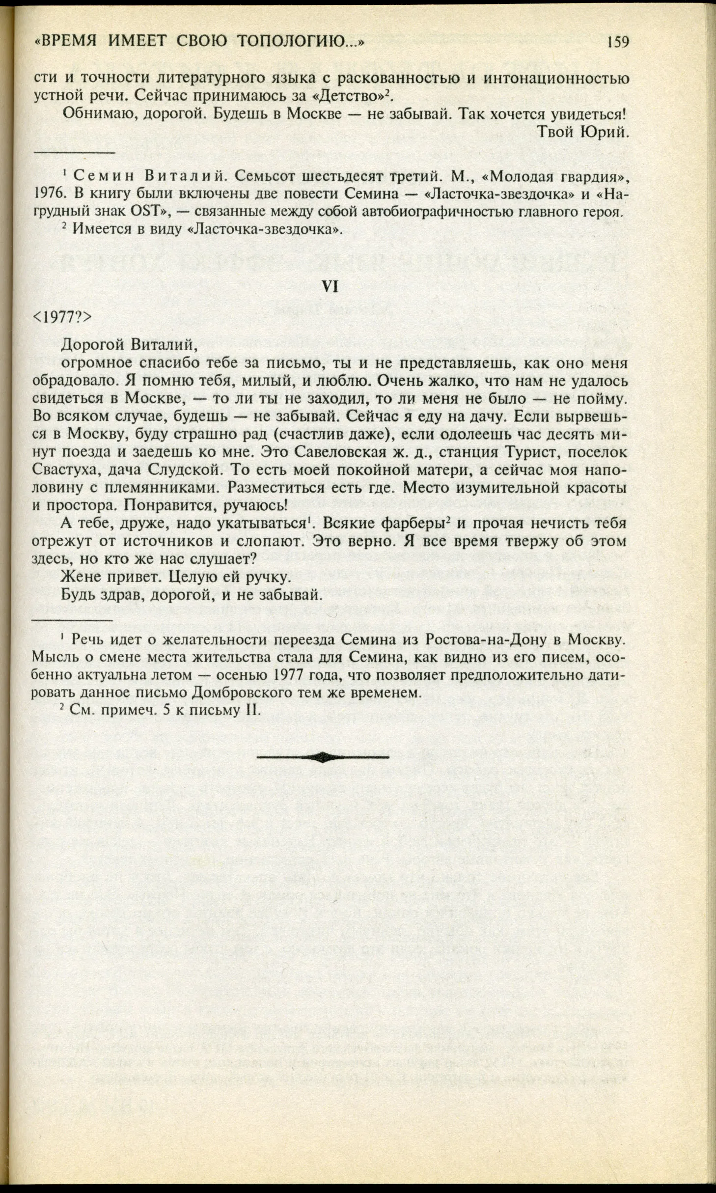 «Время имеет свою топологию…» Письма Юрия Домбровского Виталию Семину. Публикация В.Н. Кононыхиной-Семиной. Новый мир, 2004, №5, с. 150–159. Предисловие и комментарии Л. С. Дубшана.