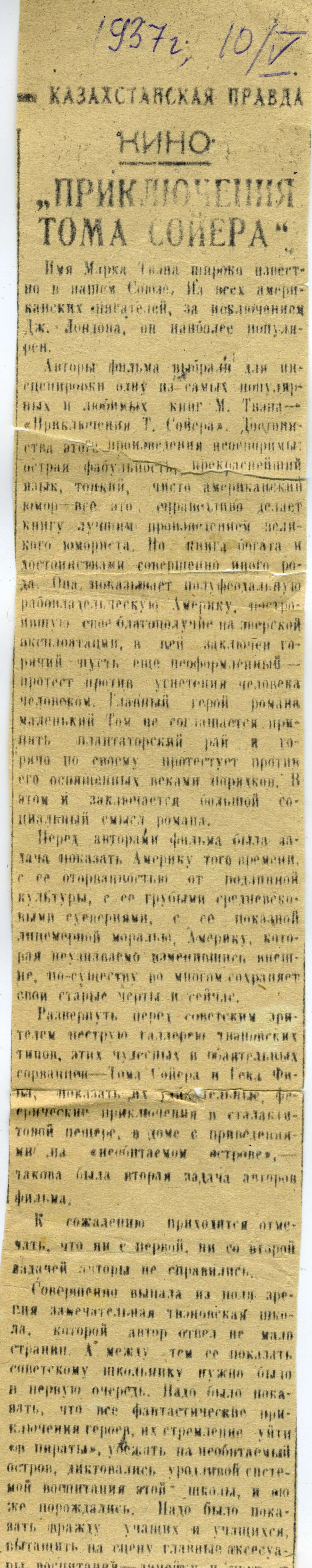 1937 г. Рецензия Ю. Домбровского на кинофильм «Приключения Тома Сойера» по мотивам одноименного романа Марка Твена (режиссеры - Лазарь Френкель, Глеб Затворницкий, производство Украинфильм, 1936 год). «Казахстанская правда», 10 мая 1937 года.