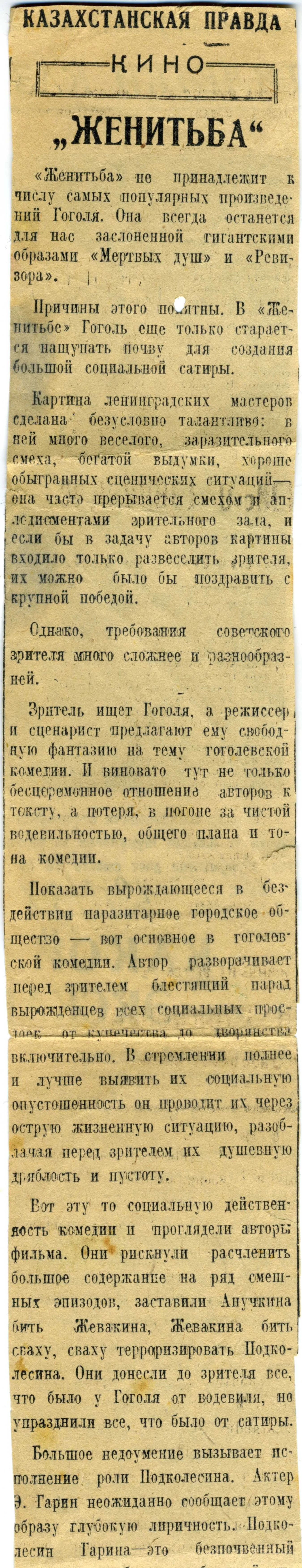 Рецензия Ю. Домбровского на кинофильм «Женитьба» по одноименной пьесе Н.В. Гоголя (режиссеры - Эраст Гарин и Хеся Локшина, производство Ленфильм, 1936 год). «Казахстанская правда», 1937 г.
