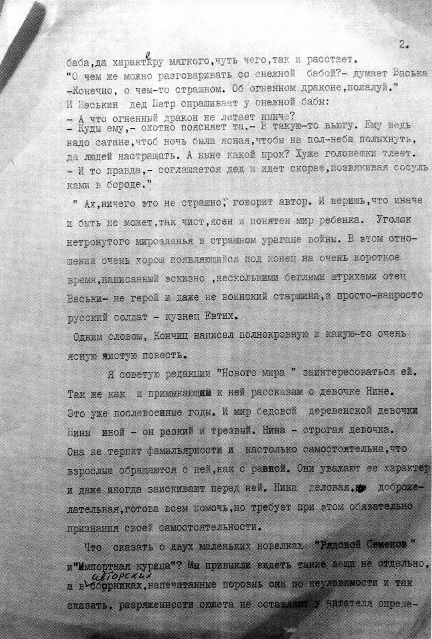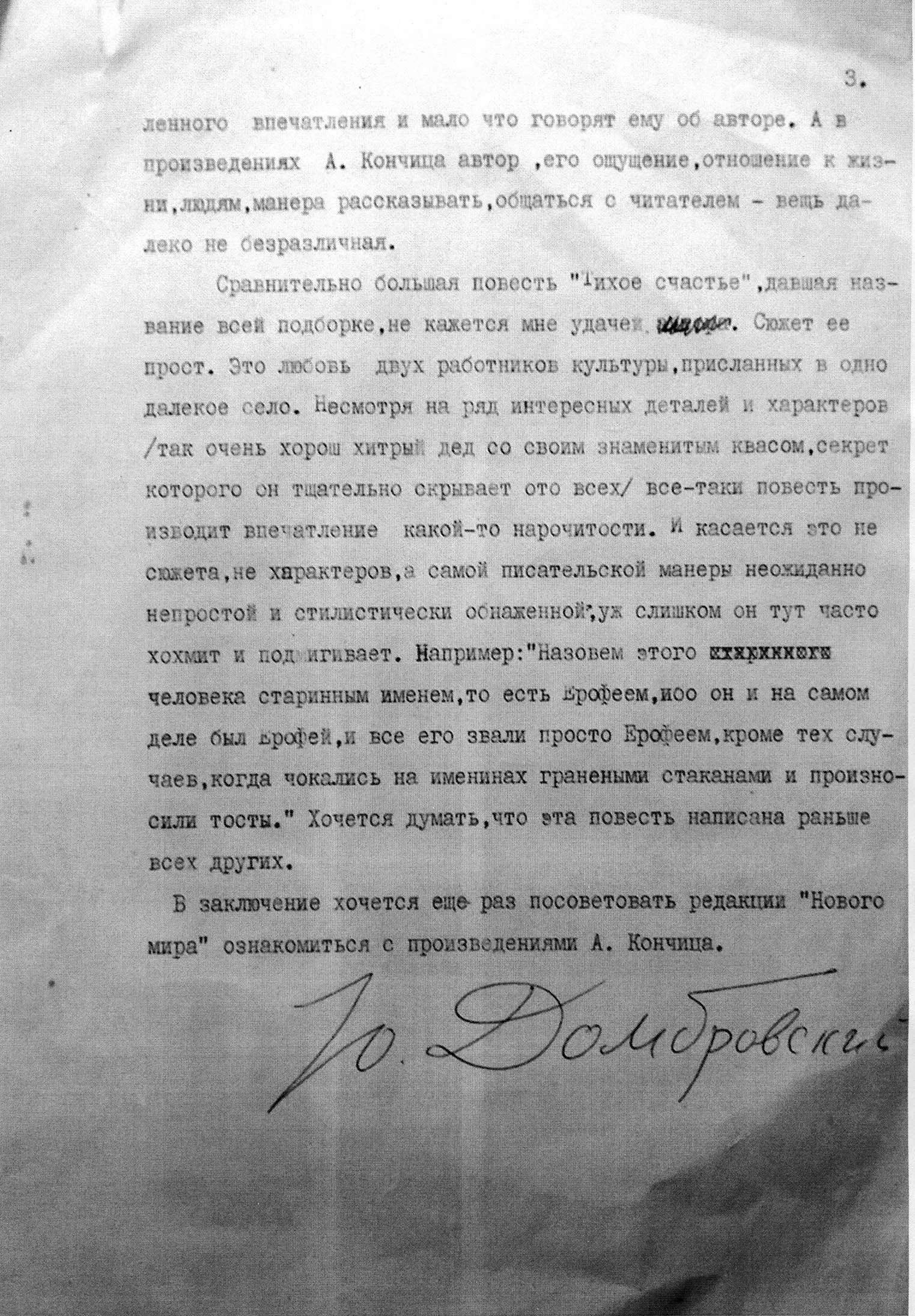 Рецензия Ю. Домбровского на рассказы А. Кончица «Тихое счастье». Из архива В. Перельмутера. (Благодарим В.Перельмутера за предоставленный материал)